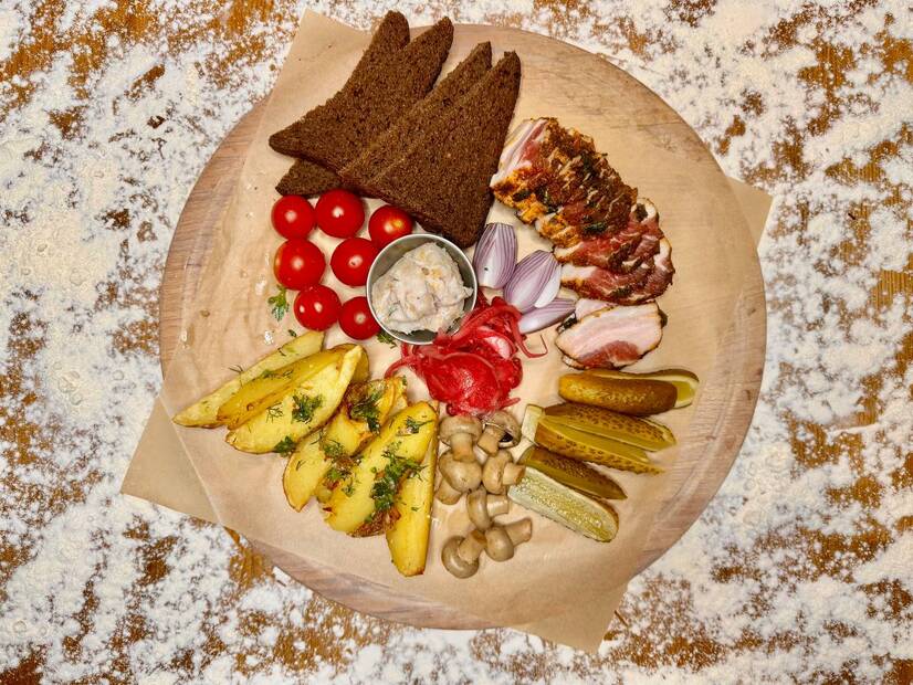 Сало підчеревина мариноване, солоний огірок, мариновані печериці, помідори консервовані, цибуля маринована, хліб бородинський, картопля по-селянськи, сало мелене зі спеціями, червона цибуля