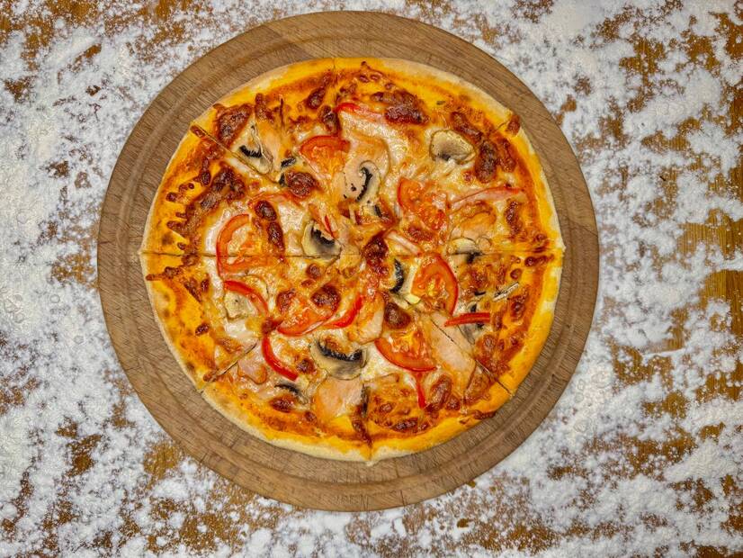 Копчене куряче філе, томати, перець болгарський, печериці, соус на основі томатів, моцарела на найкращому тісті для піци