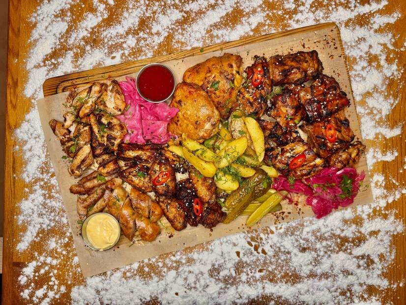 Крильця баффало, ребра в пивному соусі, шашлик з курки, куряче стегно на грилі, ковбаска куряча на грилі, ковбаски індичі на грилі, картопля по селянськи, солоний огірок, маринована цибуля, соус солодкий чилі, соус грічний.