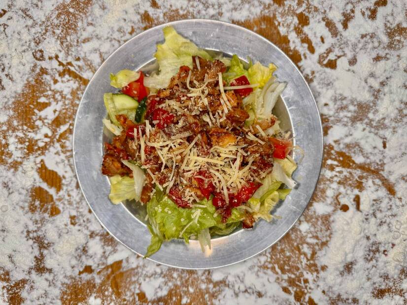 Cалат айсберг, томати чері, рвана свинина обсмажена в соусі барбекю сливовий з болгарським перцем, свіжий огірок, пармезан.