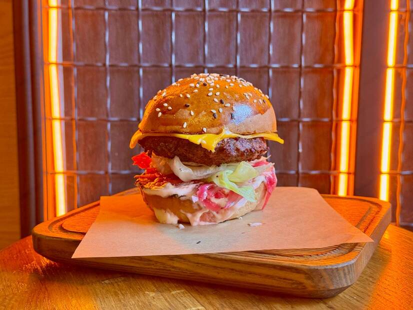 Булочка бріош, яловича котлета, айсберг, солоний огірок, маринована цибуля, соус на основі васабі та майонезу.