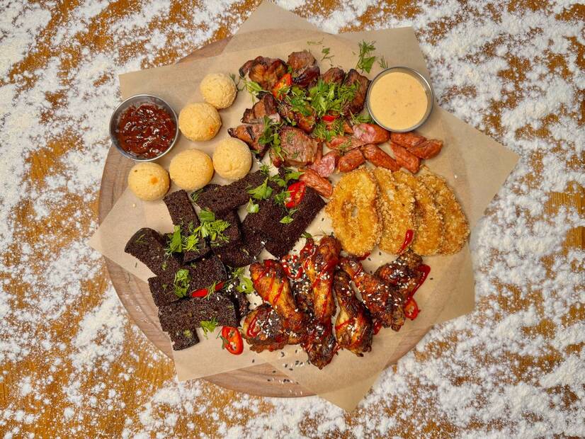 Шашлик зі свинини, крильця баффало, ковбаски пивчики, кальмар фрі, сирні кульки, сухарі бородинські, соус special, соус барбекю сливовий.